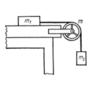1. Два тела массами m1 = 0,25 кг и m2 = 0,15 кг связаны тонкой нитью, переброшенной через блок. Блок укреплён на краю горизонтального стола, по поверхности которого скользит тело массой m1. С каким ускорением движутся тела и каковы силы T1 и T2 натяжения нити обе стороны от блока? Коэффициент трения тела о поверхность стола равен 0,2. Масса m блока равна 0,1 кг и её можно считать равномерно распределённой по ободу. Массой нити и трением в подшипниках оси блока пренебречь.